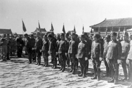 中國受降主官召日軍投降代表華北方面軍司令官根本博中將率領參謀長高橋坦以下廿一員幕僚入場。