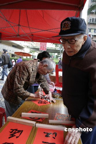 二00七臺北眷村文化節(jié)開幕,老人們在活動現(xiàn)場書寫對聯(lián)。 中新社發(fā) 陳國華 攝