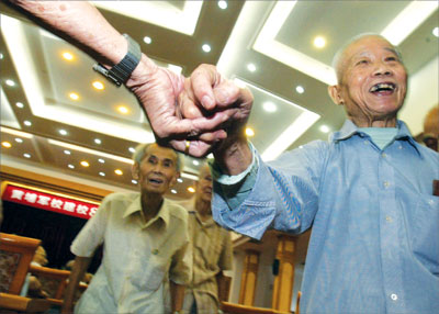 老校友手拉手走進(jìn)會(huì)堂。