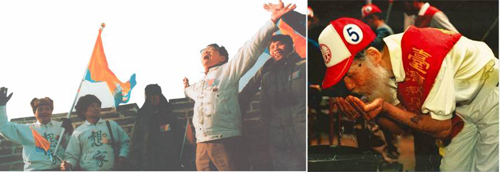 上世紀八十年代,臺灣民間涌起“老兵返鄉探親”運動,老兵身掛“回家”標語的照片。