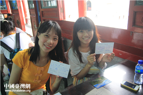 臺(tái)灣學(xué)生在長(zhǎng)城腳下給家人郵寄明信片(中國(guó)臺(tái)灣網(wǎng) 吳曉寒 攝)