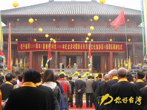 你好臺灣網4月1日消息 30日,老子誕辰2581周年《道德經》問世2501年紀念活動暨函谷關歷史文化旅游區4A級景區揭牌儀式在靈寶市函谷關大道院隆重舉行。中國老子文化發展公益基金管委會主任何俊昆、臺灣朝圣團總團長林秋雄、河南省旅游局副局長張鳳有、三門峽市副市長李琳等出席紀念活動。