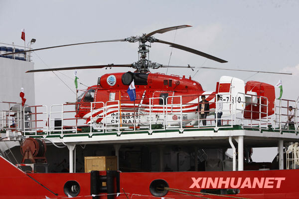 “雪龍”號上的我國南極考察首架自備卡-32型直升機(10月10日攝)。新華社記者 裴鑫 攝