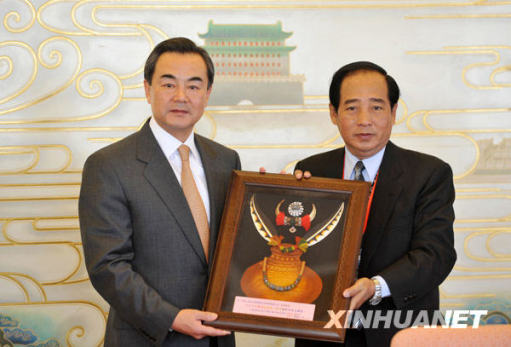 12月22日,王毅接受臺灣少數(shù)民族代表人士訪問團贈送的禮品。新華社記者 金良快 攝