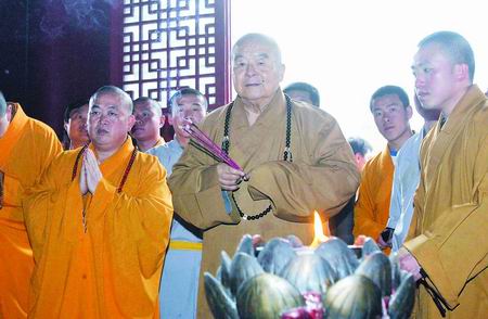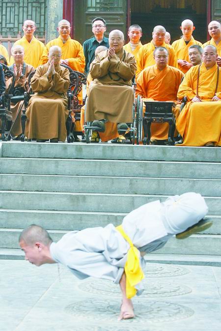 星云法師很風(fēng)趣地說(shuō):“我謝謝你們!我坐在輪椅上很沉的,你們幾個(gè)武僧就像拎小雞一樣輕松地抬著我就走了,這也說(shuō)明你們功夫修習(xí)得好,你們的功夫能助人,今天就幫助了我。我謝謝你們!在臺(tái)灣的佛光山之外,在世界上我們還建了幾個(gè)佛光山,你們到世界各地的佛光山都是佛光山的貴賓,我還要請(qǐng)少林武僧到佛光大學(xué)傳授武術(shù)!币环捔钅贻p的武僧們歡呼雀躍。