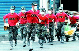 臺軍中出現(xiàn)44個甲型流感確診病例,其中4人是在屏東救災的臺軍官兵,為免疫情擴大,在災區(qū)清淤、挖尸的救災臺軍,昨天統(tǒng)統(tǒng)戴上口罩,保持最佳體力。(來源:臺灣《聯(lián)合報》)