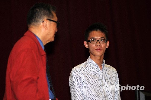 5月25日,李敖回到母校臺灣大學開講,他今年剛剛考取臺灣大學的小兒子李戡也一并出席演講并與父親同坐演講臺,這也是他首次正式參與父親的活動。在提問環節,李戡介紹了他將要出版的批判臺灣中學歷史教育的新書。中新社發鄭宇鈞 攝