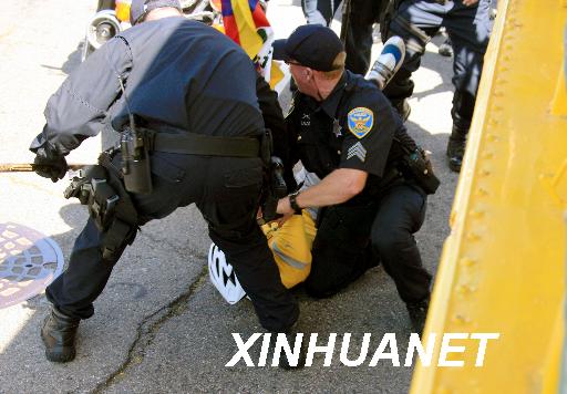 當?shù)貢r間4月9日,北京時間4月10日,奧運火炬在美國舊金山傳遞時,一名企圖搶奪火炬的“藏獨”分子被當?shù)鼐飚攬鲋品P氯A社記者李穎攝