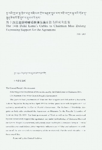 中央人民政府毛主席:今年西藏地方政府特派全權代表噶倫阿沛等五人于1951年4月底抵達北京,與中央人民政府指定的全權代表進行和談。雙方代表在友好基礎上已于1951年5月23日簽訂了關于和平解放西藏辦法的協議。西藏地方政府及藏族僧俗人民一致擁護,并在毛主席及中央人民政府領導下積極協助人民解放軍進藏部隊鞏固國防,驅逐帝國主義勢力出西藏,保護祖國領土主權的統一,謹電奉聞。