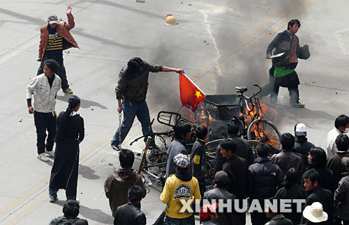 這張路透社播發(fā)的照片顯示,3月14日, 在拉薩市,一名右手持鐵鏈的不法分子在焚燒中國(guó)國(guó)旗,另一名不法分子手持長(zhǎng)刀。新華社發(fā)