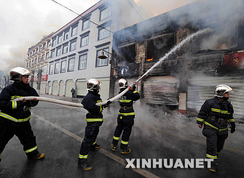 3月14日,消防官兵在拉薩市街頭滅火。 新華社記者 覺(jué)果 攝