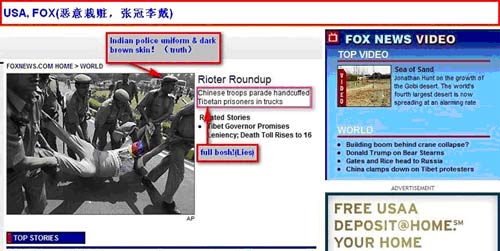 美國FOX新聞網將一張印度軍人拖走示威者的圖片,配上“中國軍隊將示威者拷走”的說明。