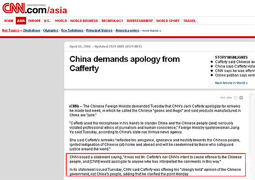 CNN的聲明辯稱卡弗蒂也常常批評他國政府,包括美國政府和布什總統。但批評是批評,辱罵歸辱罵,這截然不同的界線他們分不清嗎?卡弗蒂也用“暴民”﹑“匪徒”﹑“惡棍”那樣的咒語對付過他的美國同胞和政府嗎?以如此惡毒的言辭橫加于中國人頭頂,只說明卡弗蒂等人心底的惡意。