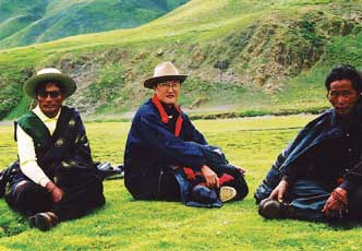 格勒(中)在藏區考察時和牧民在一起(格勒提供)