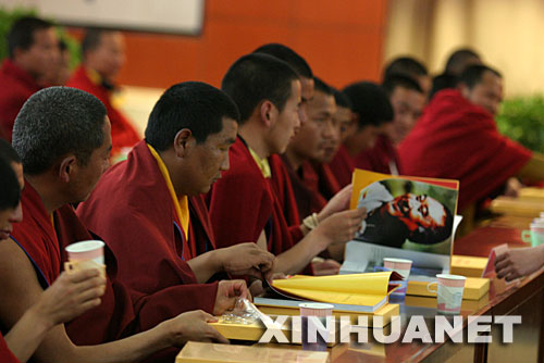 4月16日,《第十一世班禪額爾德尼·確吉杰布在迪慶》畫冊首發(fā)儀式在云南迪慶藏族自治州首府香格里拉舉行。圖為佛教界代表在翻閱畫冊。 新華社發(fā)(李映懷 攝)