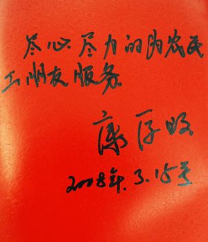 | 全國人大代表、來自重慶的農(nóng)民工康厚明為強(qiáng)國論壇題字 |