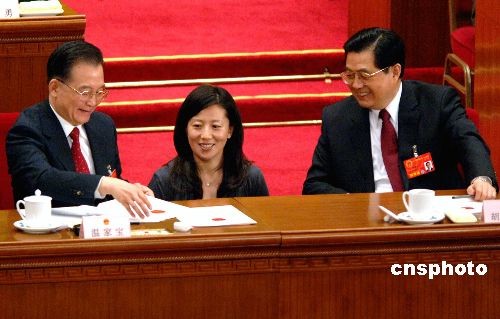 三月十五日上午,十一屆全國(guó)人大一次會(huì)議第五次全體會(huì)議在北京人民大會(huì)堂舉行。圖為會(huì)議進(jìn)行投票間隙,胡錦濤(右)、溫家寶(左)與奧運(yùn)冠軍楊揚(yáng)在主席臺(tái)上交談。中新社發(fā)王東明攝