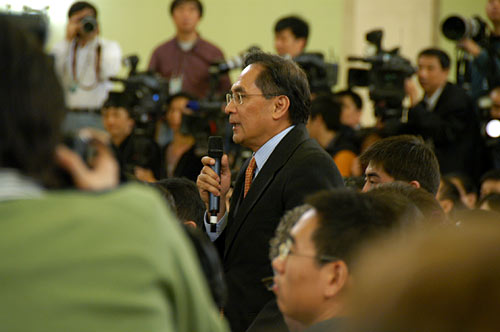 3月18日,國務院總理溫家寶和副總理李克強、回良玉、張德江、王岐山在北京人民大會堂與中外記者見面,并回答記者提問。圖為美國有線新聞網的記者在提問。新華網 郭毅 攝