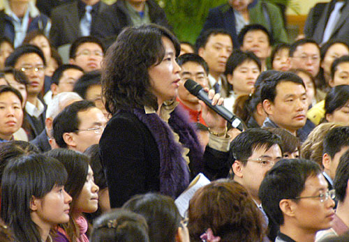3月18日,國務(wù)院總理溫家寶和副總理李克強、回良玉、張德江、王岐山在北京人民大會堂與中外記者見面,并回答記者提問。圖為臺灣工商時報記者在提問。新華網(wǎng) 郭毅 攝