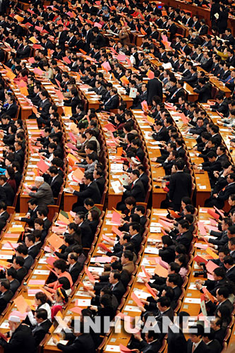 3月16日,十一屆全國人大一次會議在北京人民大會堂舉行第六次全體會議。決定國務院總理人選;決定中華人民共和國中央軍事委員會副主席、委員人選;選舉最高人民法院院長;選舉最高人民檢察院檢察長。這是大會會場。