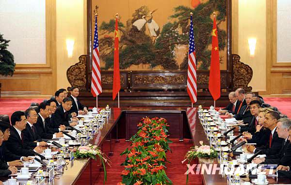 11月17日上午,中國國家主席胡錦濤在北京人民大會堂東大廳與美國總統奧巴馬舉行正式會談。新華社記者 黃敬文 攝