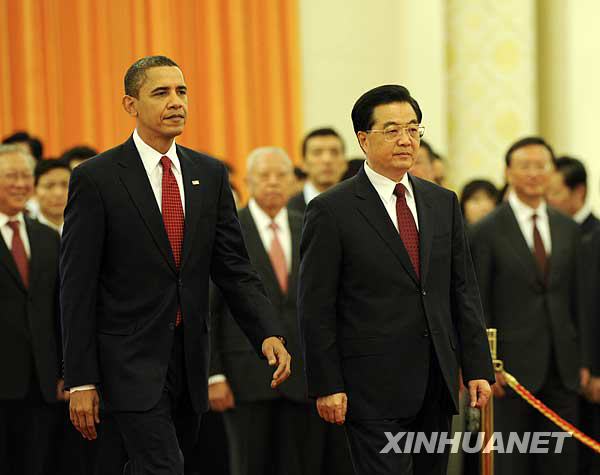 11月17日上午,國家主席胡錦濤在北京人民大會(huì)堂北大廳為美國總統(tǒng)奧巴馬訪華舉行歡迎儀式。新華社記者 蘭紅光 攝