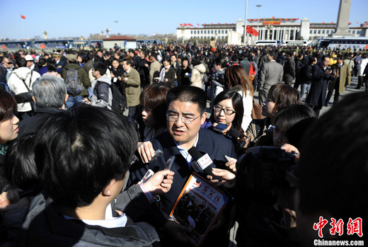 3月3日下午,全國(guó)政協(xié)十一屆四次會(huì)議在北京人民大會(huì)堂開幕。圖為大會(huì)開幕前,全國(guó)政協(xié)特邀委員、“中國(guó)首善”陳光標(biāo)被記者包圍采訪。中新社發(fā) 劉震 攝