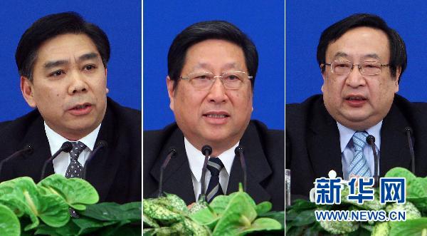 3月6日,國家發(fā)展和改革委員會主任張平(中)、國家發(fā)展和改革委員會副主任朱之鑫(右)與國家發(fā)展和改革委員會副主任徐憲平回答記者提問。當日,十一屆全國人大四次會議在北京人民大會堂金色大廳舉行記者會,國家發(fā)展和改革委員會負責人就“十二五”規(guī)劃綱要回答記者提問。新華社記者邢廣利攝