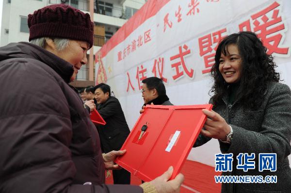 2011年1月17日,渝北區(qū)政府向市民發(fā)放新房鑰匙。當(dāng)日,重慶市渝北區(qū)“民生工程”洛磧廉租房項(xiàng)目,向符合入住條件的600戶城鎮(zhèn)住房困難群眾發(fā)放了新房鑰匙。洛磧廉租房項(xiàng)目是重慶市渝北區(qū)政府投入5000萬元修建的困難群眾保障性住房,在未來5年時(shí)間內(nèi),渝北區(qū)還將建設(shè)300萬平米的保障性住房。新華社記者 陳誠 攝