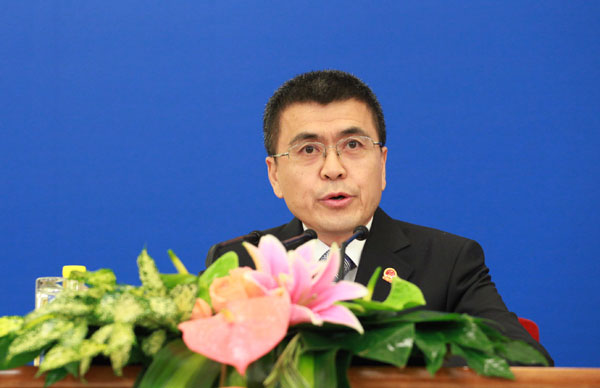3月7日上午10點,十一屆全國人大四次會議在人民大會堂三樓大廳舉行中外記者會,由外交部部長楊潔篪就外交政策和對外關(guān)系問題答記者問。圖為全國人大常委會副秘書長、記者會主持人曹衛(wèi)洲。 吳莼攝