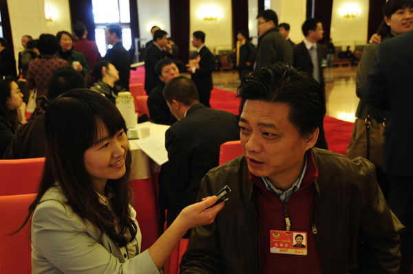 3月9日9時,全國政協十一屆四次會議第二次全體會議在人民大會堂舉行。圖為全國政協委員崔永元接受新華網記者專訪。宋君毅 攝
