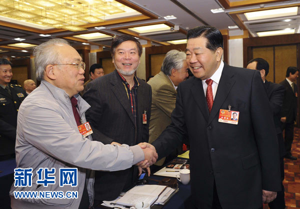 3月8日,中共中央政治局常委、全國政協主席賈慶林參加全國政協十一屆四次會議文藝界委員討論。 新華社記者 饒愛民攝