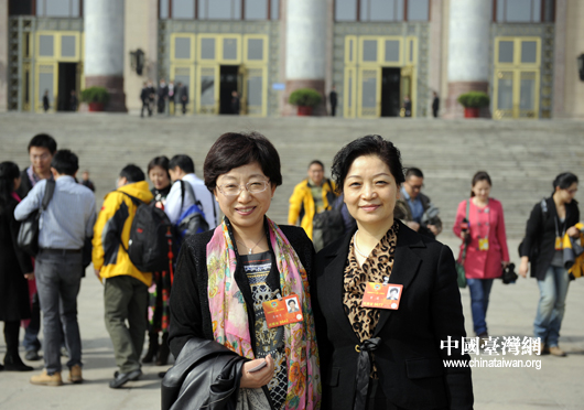 在天安門廣場上,女委員成為媒體記者追捧的焦點。(中國臺灣網 發)