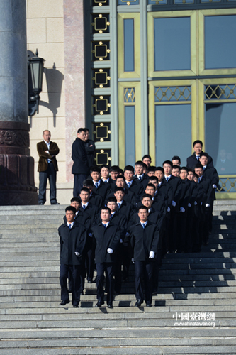 會(huì)議結(jié)束后,安保人員列隊(duì)雄姿英發(fā)走出人民大會(huì)堂。