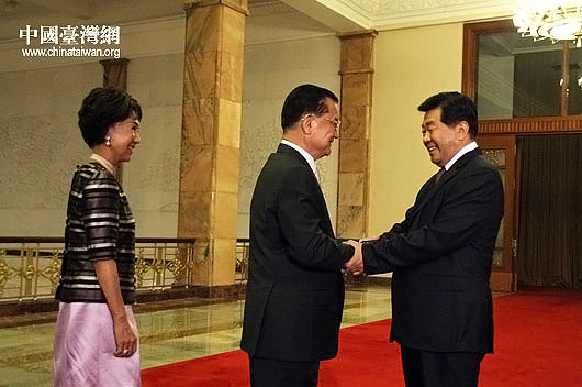 7月27日下午,中共中央政治局常委、全國政協主席賈慶林在北京人民大會堂北京廳會見了來訪的中國國民黨榮譽主席連戰一行。(中國臺灣網 鐘寶華 攝)