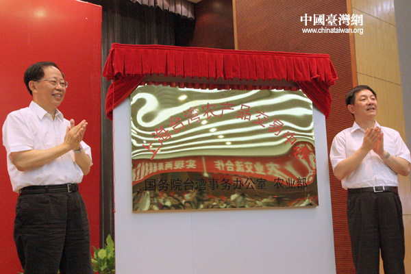 國臺辦副主任葉克冬(右)與農業部副部長危朝安為“上海臺灣農產品交易中心”揭牌。(中國臺灣網 邵磌 攝)