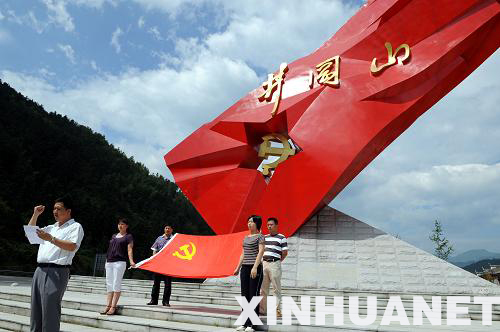 6月30日,江西省井岡山市廈坪鎮基層黨員干部在井岡紅旗雕塑下宣誓,重溫入黨誓詞!捌咭弧眮砼R之際,前來江西井岡山祭奠革命先烈的黨員干部絡繹不絕。他們重溫入黨誓詞,學習井岡山精神,迎接黨的88歲生日。新華社記者 馬平攝