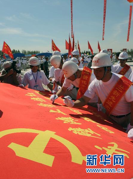 6月28日,工地上的黨員建設(shè)者簽名開展迎接建黨89周年?duì)巹?chuàng)先進(jìn)活動(dòng)。當(dāng)天,正在建設(shè)中的蘭(州)新(疆)鐵路二線工程新疆段舉行了建黨89周年紀(jì)念及黨員突擊隊(duì)授旗儀式。參加該工程建設(shè)的中國(guó)中鐵四局近千名建設(shè)者隆重宣誓,以共產(chǎn)黨員的先鋒模范帶頭作用,克服施工困難,高質(zhì)量嚴(yán)要求地完成國(guó)家重點(diǎn)建設(shè)工程。新華社記者王雷攝