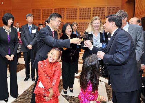 9月28日,在美國首都華盛頓,中國駐美國大使張業(yè)遂(右)在國慶招待會上與美國商務部長駱家輝等祝酒。當天,中國駐美國大使館舉行國慶招待會,慶祝中華人民共和國成立61周年,美國政府官員、駐美外國使節(jié)和各界友好人士等數(shù)百人出席。新華社記者 張軍 攝