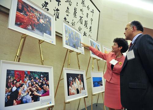 9月28日,在美國首都華盛頓,來賓在國慶招待會上觀看圖片展覽。 當天,中國駐美國大使館舉行國慶招待會,慶祝中華人民共和國成立61周年,美國政府官員、駐美外國使節(jié)和各界友好人士等數(shù)百人出席。新華社記者 張軍 攝