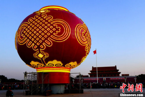 9月22日清晨,北京天安門廣場上搭建的迎國慶巨型大紅燈籠主體工程完工,吸引游人拍攝留影。2011年9月22日,北京天安廣場迎國慶巨型大紅燈籠主花壇,經(jīng)過工人師傅們的連續(xù)奮戰(zhàn),在清晨5點(diǎn)50分,巨型大紅燈籠上的裝飾中國節(jié)燈管點(diǎn)亮,標(biāo)志著巨型大紅燈籠主體工程完工。