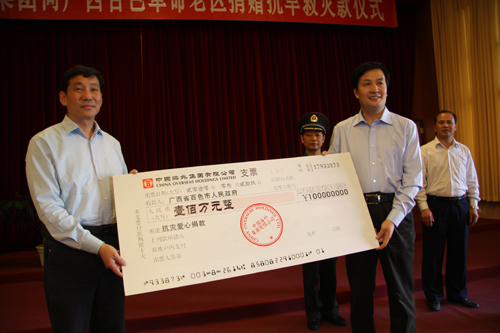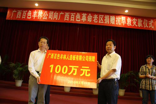 人民網百色3月31日電 (記者龐革平、謝建偉)3月31日下午,香港中國海外集團有限公司和廣西百色豐林人造板有限公司分別向廣西百色災區(qū)捐款100萬元。此前,上海浦東發(fā)展銀行股份有限公司已向百色市捐款50萬元,百色軍分區(qū)及所屬部隊官兵則為百色市捐款10.29萬元。