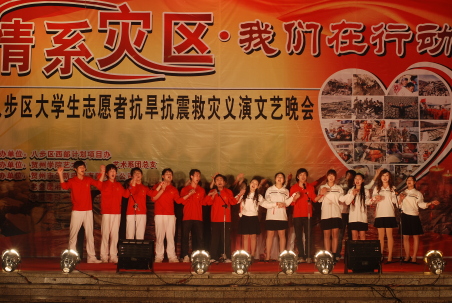 23日晚,廣西賀州市一臺由八步區西部計劃項目辦主辦、賀州學院藝術系承辦的大學生志愿者抗旱抗震救災義演文藝晚會在賀州市靈峰廣場舉行,得到熱心企業和廣大市民踴躍響應,共募集善款8萬元支持災區。