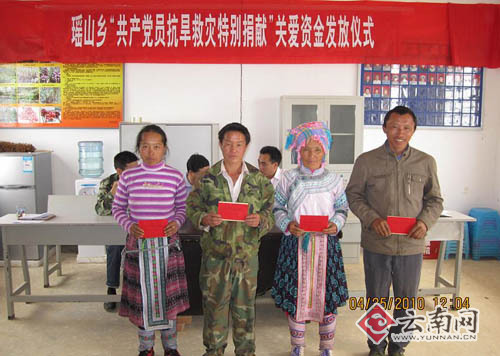4月25日,河口縣瑤山鄉在八角村委會舉行“共產黨員抗旱救災特別捐獻”關愛資金發放儀式。共向八角村委會回龍、箐腳二個小組臨時飲水困難戶105戶454人,發放關愛資金52500元。