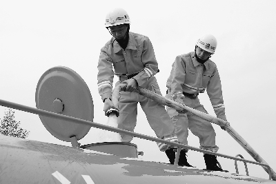 4月1日,貴州省黔西南州興仁縣消防大隊兩名消防士兵緊緊握住水管給抗旱救災車灌水。