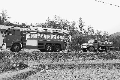 4月1日,貴州省黔西南州興仁縣消防大隊用消防車給魯?shù)A營回族鄉(xiāng)抗旱救災拉水車送水。