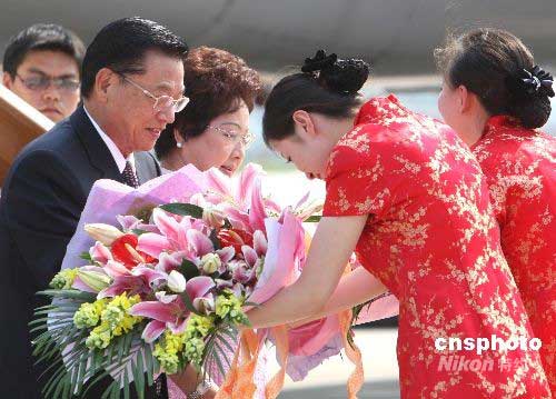 十一日下午三時十五分許,臺灣海峽交流基金會董事長江丙坤率;鶗韴F抵達北京首都機場,禮儀小姐敬獻鮮花。中新社發 趙振清 攝
