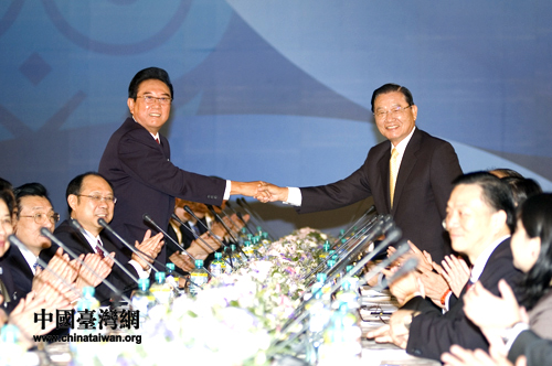 回到二次“陳江會”的現場,這里有著濃郁的中國式風格,高高的穹頂上,一條蒼龍口銜寶珠盤旋而下,氣勢宏大。在這樣一個充滿中華傳統文化特色的地方,當江丙坤、陳云林分別致辭之后,應現場記者的要求,兩人又再次起立握手,將現場的氣氛推向了一個新的高潮。