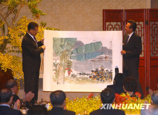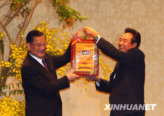 11月4日,連戰向陳云林贈送禮物。當日,中國國民黨榮譽主席連戰在臺北宴請海協會會長陳云林一行。 新華社記者 邢廣利 攝