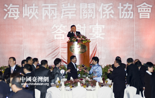 中國臺灣網11月6日臺北消息 海峽兩岸關系協會6日晚在臺北市圓山飯店舉行答謝晚宴,宴請海基會董事長江丙坤及海基會有關人士,并慶祝兩會成功簽署四項協議。